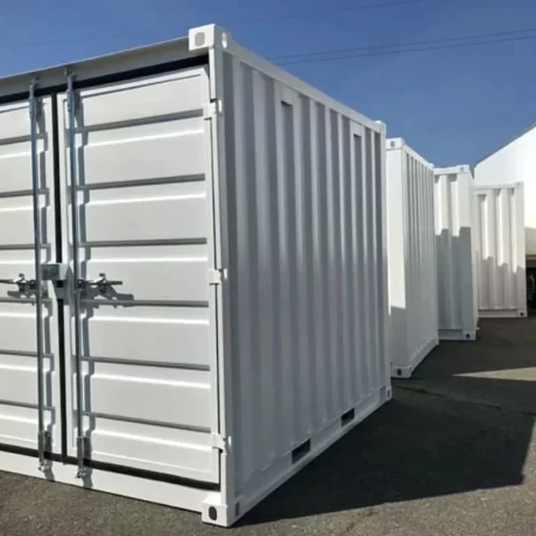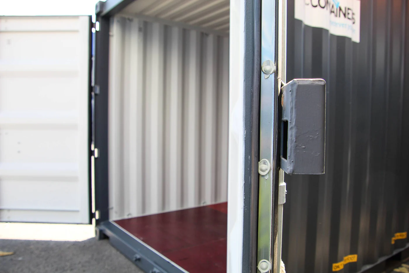 El contenedor tiene puertas dobles en un lado, con barras de cierre y protección de cerradura.